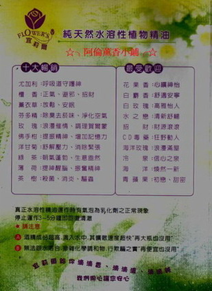 香味:檀香、花果香、薰衣草、玫瑰、白玫瑰、檸檬香茅、綠野香草、水之戀、芬多精、CD毒藥、海洋、海洋玫瑰、冷泉、薄荷、佛手柑、風信子、茉莉、水蜜桃、熊寶貝、香奈兒、檸檬、清秀佳人、百花、CK1、百合、琥珀、三宅一生、檜木、正點、依蘭、招財、尤加利、洋甘菊、青蘋果、紫羅蘭、夜來香、迷迭香、松樹、白麝香